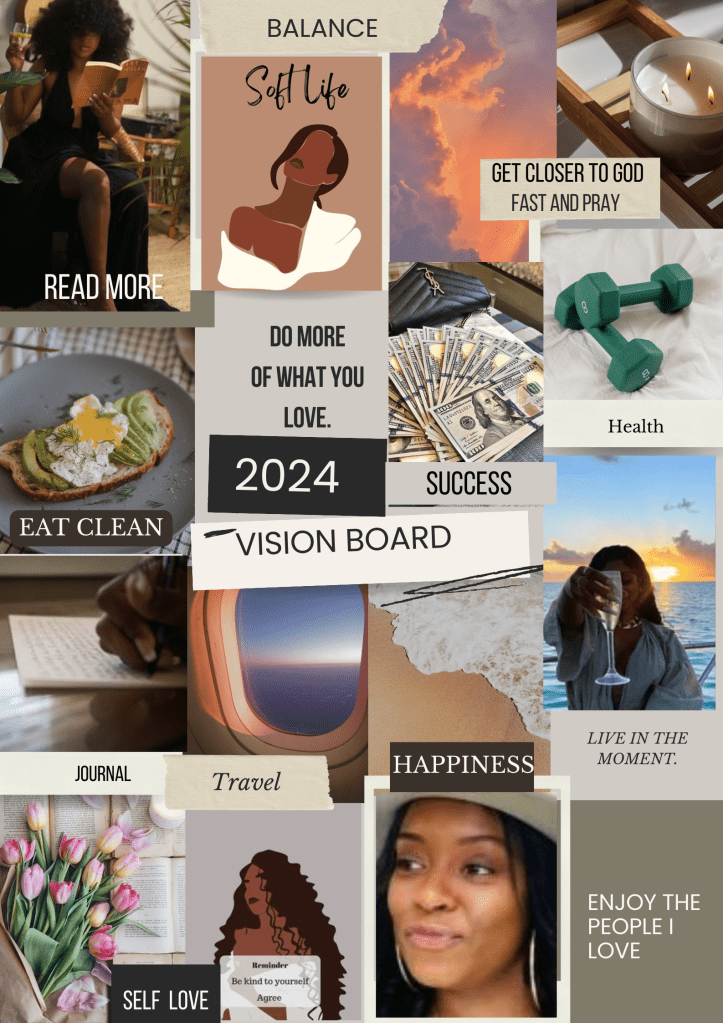 When I started the year, I didn’t want to do create a vision board because I had a few things I needed to complete from 2023. I also had some things I did not want to bring into 2024 that needed to be put into practice see post ( Things I am leaving in 2023).